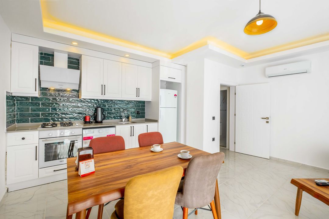 Das klimatisierte Apartment verfügt über ein Schlafzimmer mit Doppelbett, offener Wohnbereich mit Küche und ein modernes Badezimmer mit Duschkabine, WC, Waschbecken und Fön. Der Wohnbereich grenzt an die komplett ausgestattete Küche welche mit Herd/Backofen, Kühlschrank, Geschirrspüler, Waschmaschine, Wasserkocher keinen Wunsch offen lässt. Von der Dachterrasse hat man einen herrlichen Blick auf Kas und die umliegenden Buchten. Im Garten sind Sitz- und Grillmöglichkeiten vorhanden.