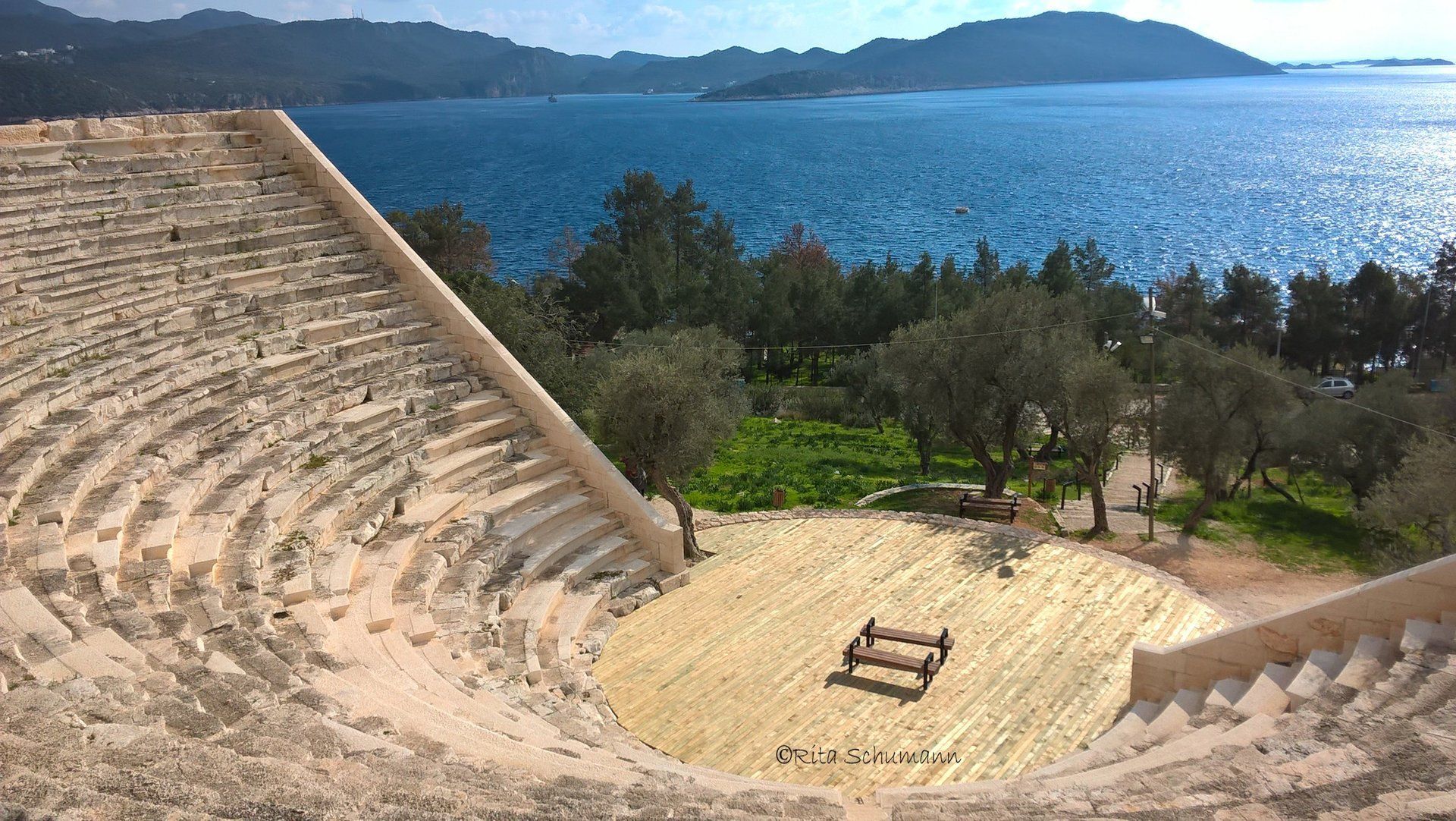 Fast in der Mitte zwischen Antalya und Dalaman liegt der kleine Küstenort Kaş - übersetzt die "Augenbraue" was von der geologischen Lage herführt. Die Landseite bildet Kaş als "Augenbraue" und die gegenüberliegende griechische Insel Castellorizon - Meis - bildet das Auge.