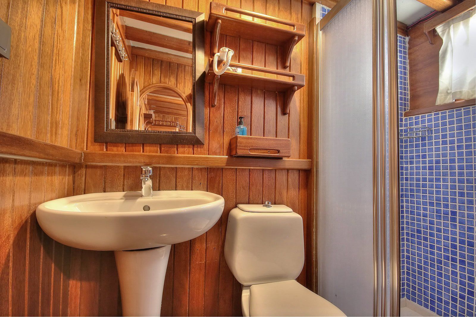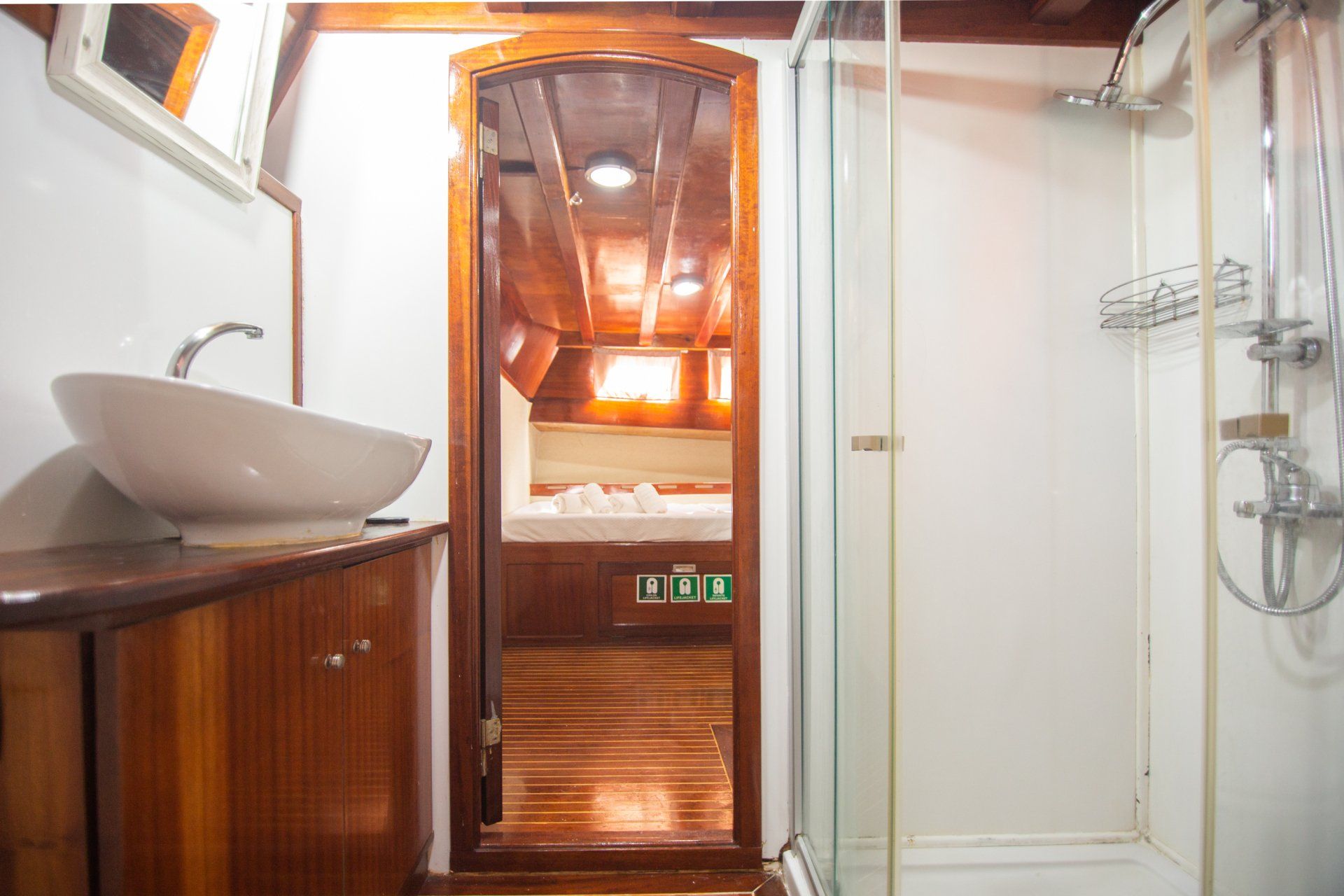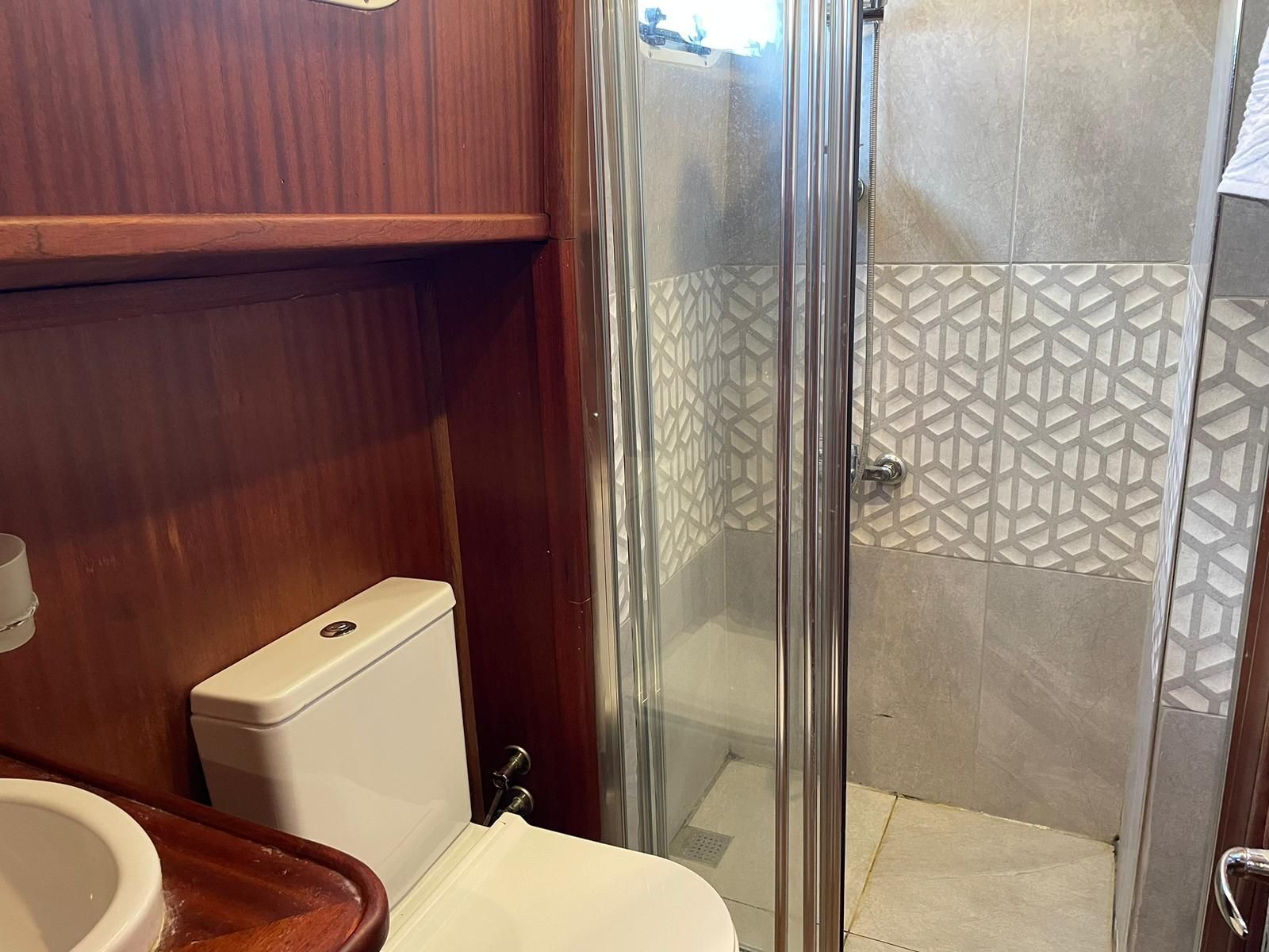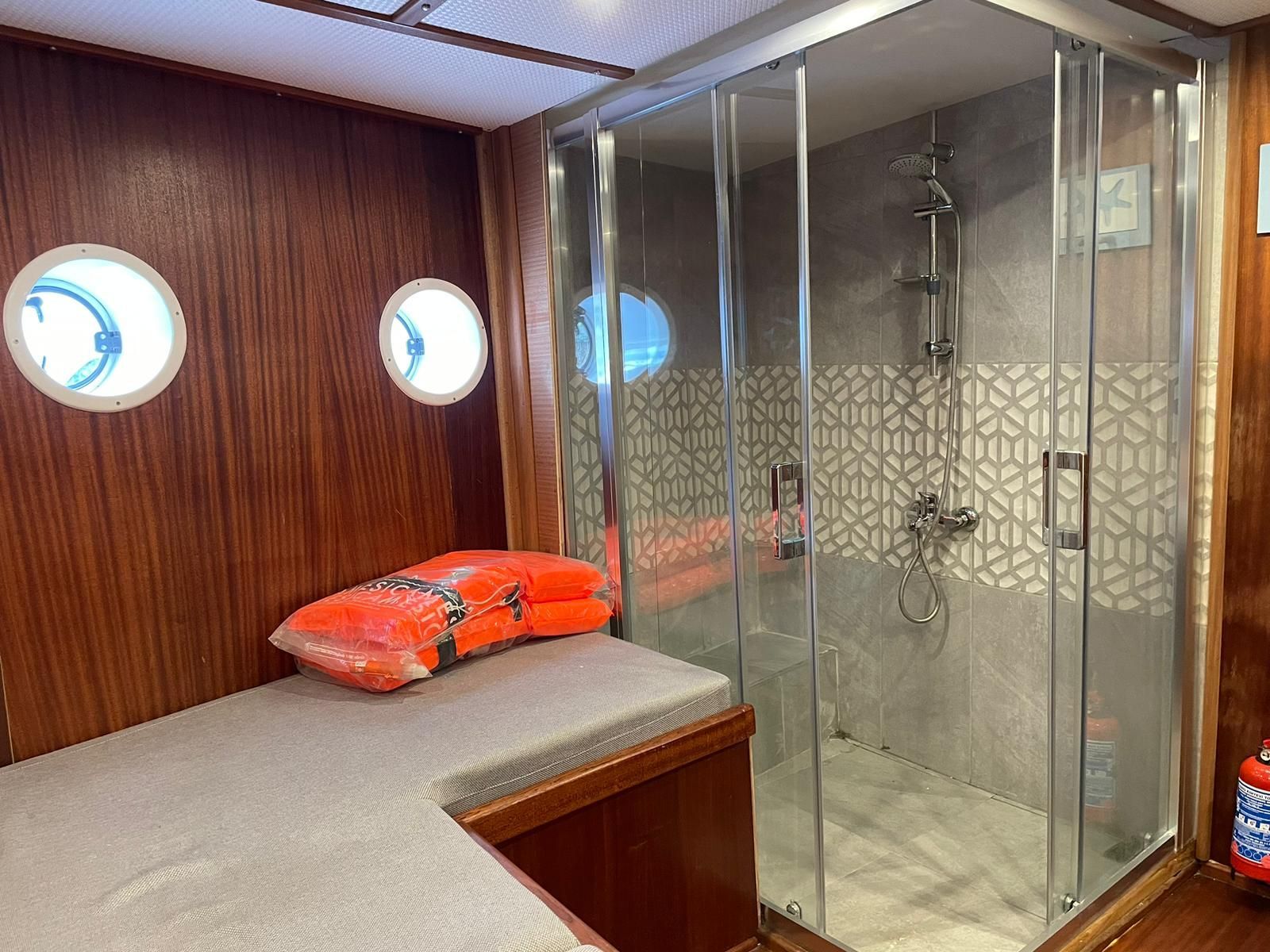 - 6 klimatisierte Kabinen mit Doppelbett und Badezimmer mit Dusche, WC
