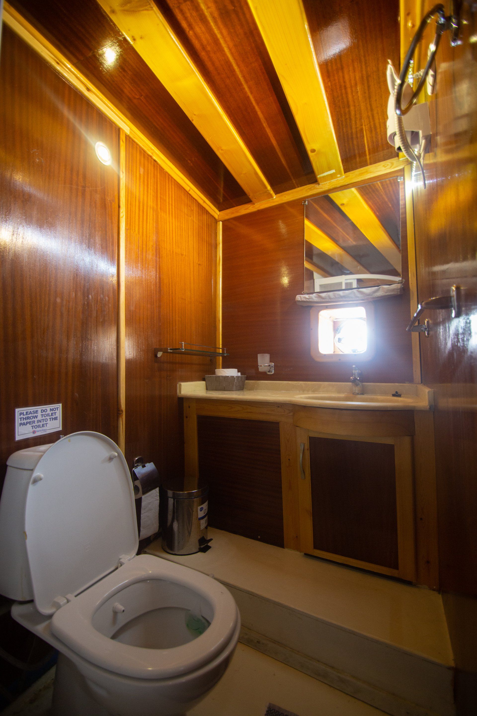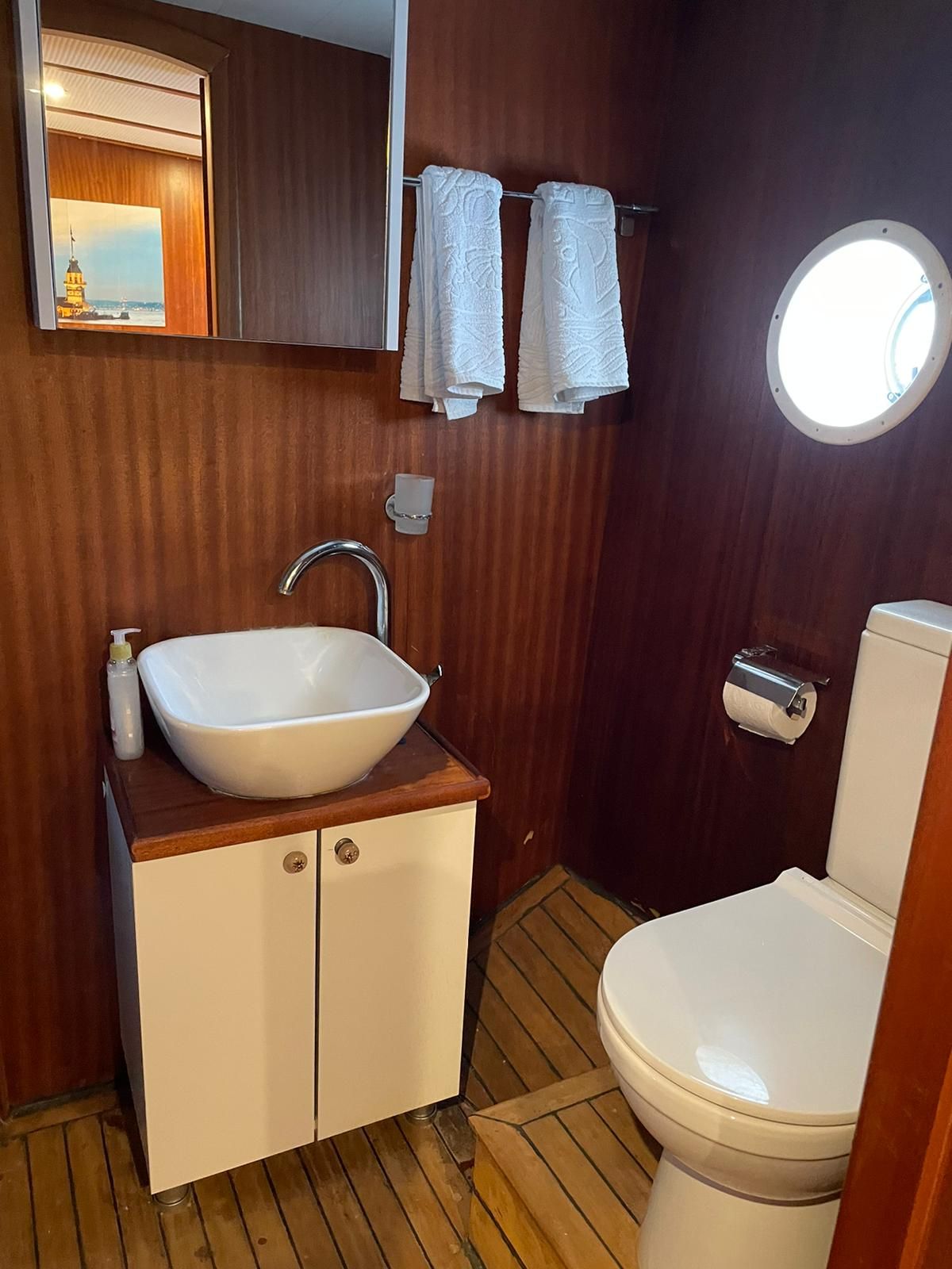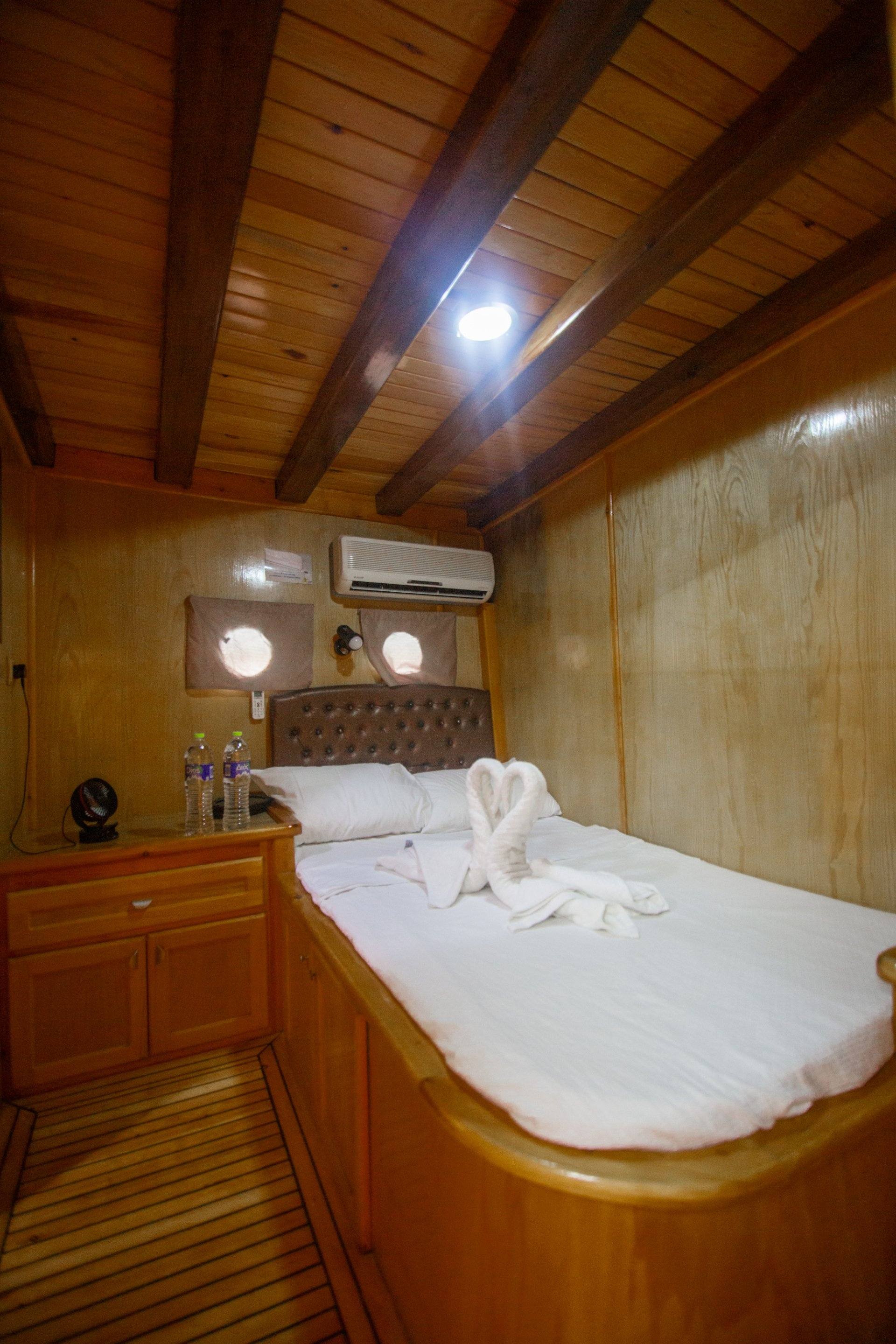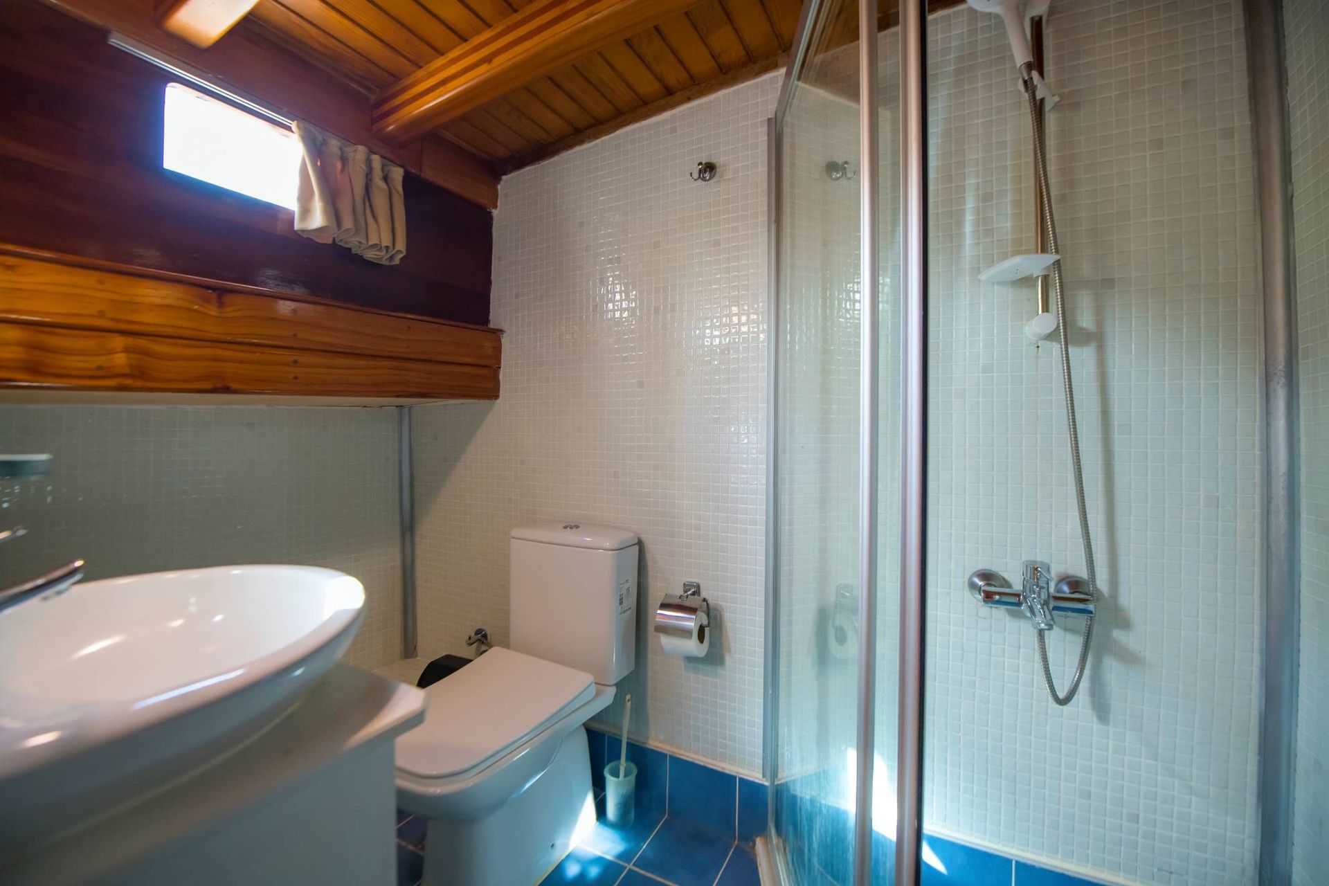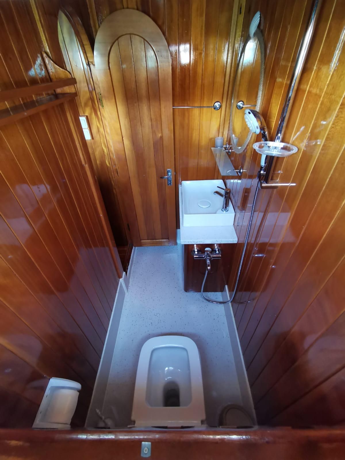 - 6 klimatisierte Kabinen mit Doppelbett und Badezimmer mit Dusche, WC