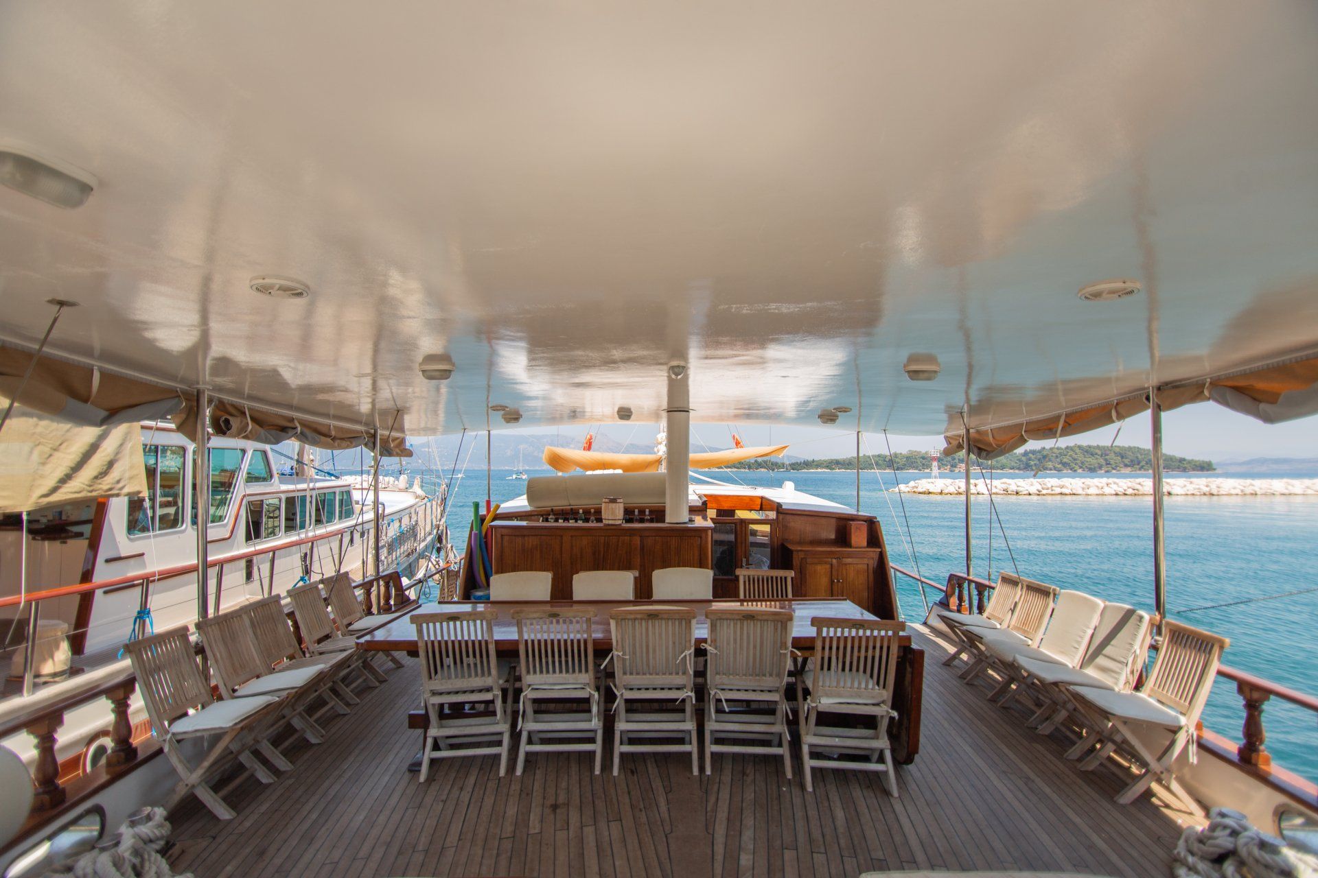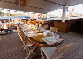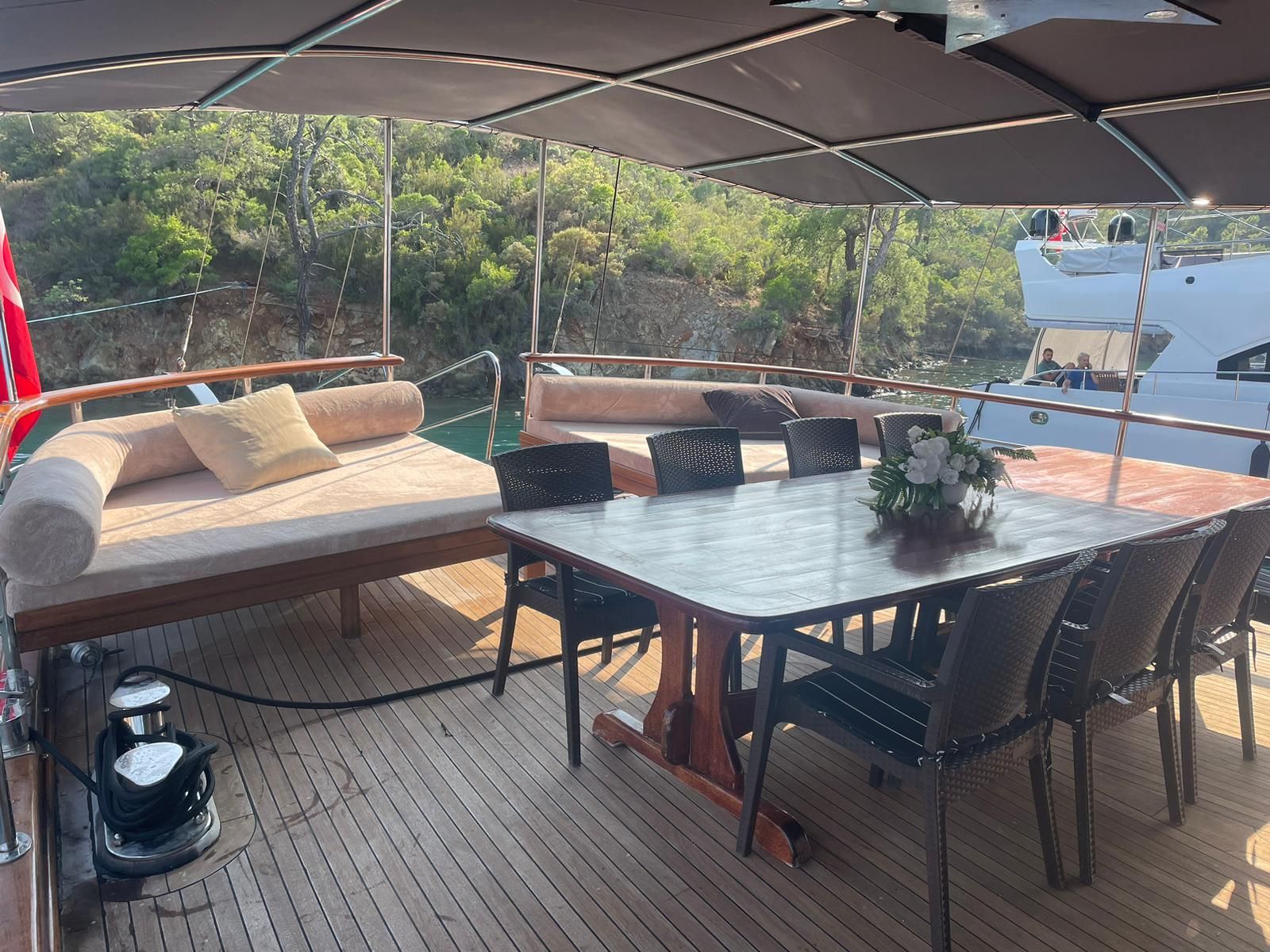 - Hinterdeck mit großer Chill-Ecke zum Relaxen und Verweilen, großem Tisch für die gemeinsamen Mahlzeiten, sowie einer Theke (für den Service der Gäste) - die Gäste werden bedient