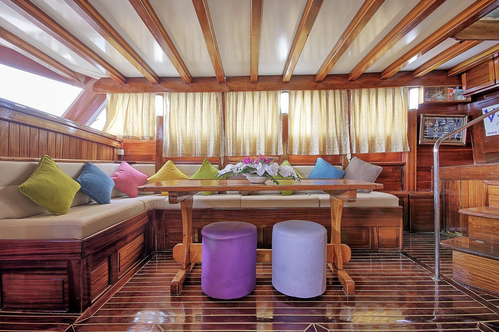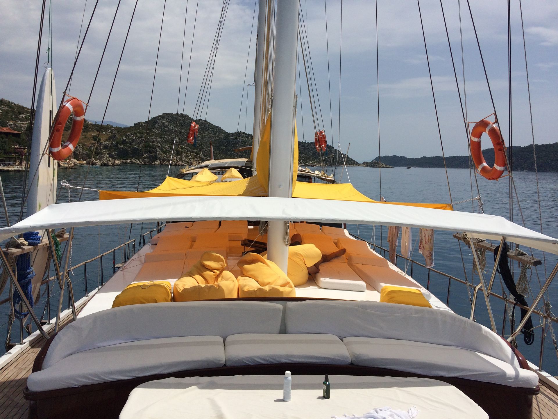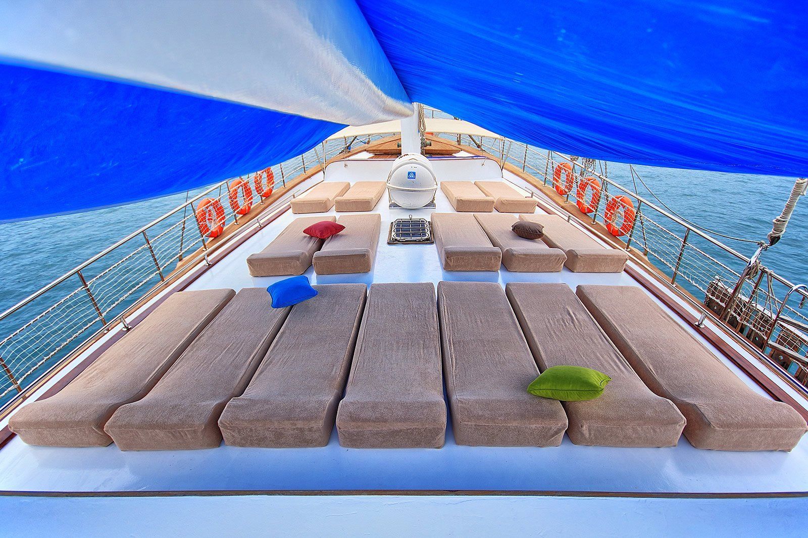- Vorderdeck mit großem Sonnendeck mit Sonnenmatten für alle Gäste, sowie weiterer Sitzecke mit kleinen Tischen- hier können traumhafte Sonneuntergänge genossen werden.