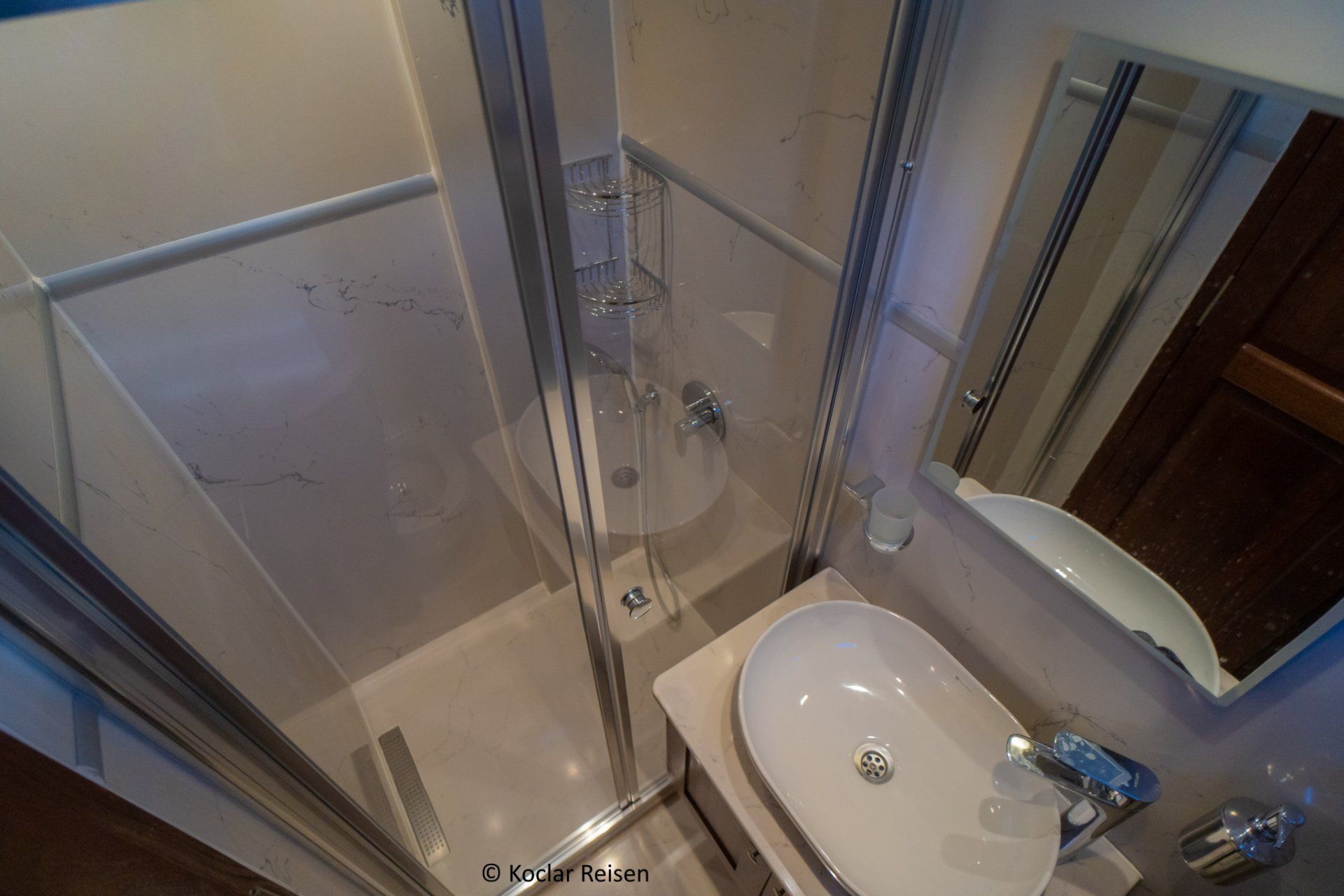 - 5 Doppelkabinen mit Doppelbett und sowie Badezimmer mit Dusche, WC